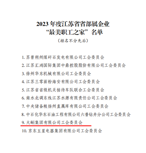 ? ?大峘集團(tuán)有限公司工會(huì)等10家單位獲評(píng)2023年度江蘇省省部屬企業(yè)“最美職工之家”稱號(hào)。